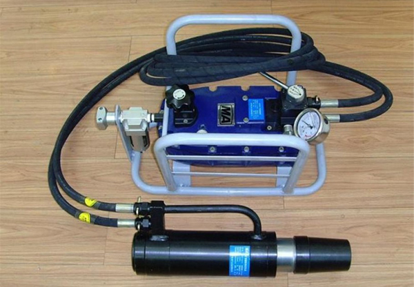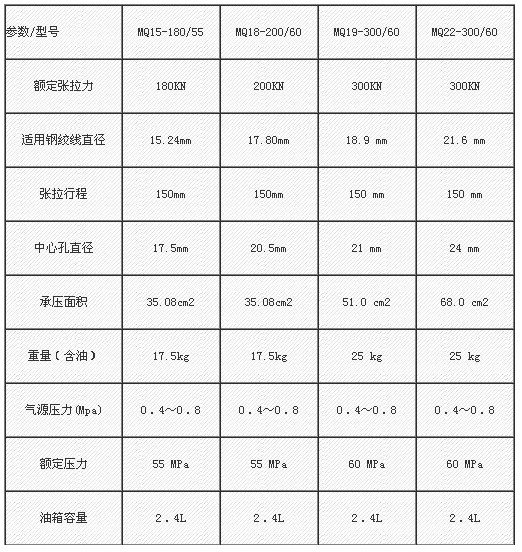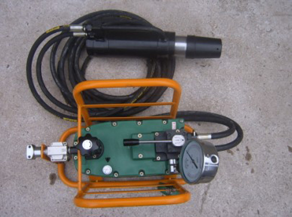 MQ型氣動錨索張拉機(jī)具由張拉千斤頂、QYB-55型氣動液壓泵以及高壓膠管等組成,構(gòu)成一組煤礦巷道錨索預(yù)應(yīng)力張拉安裝的必備工具。張拉千斤頂內(nèi)置工具錨,不但實現(xiàn)自動錨固和自動退錨,而且了操作安全,提高了工作效率。