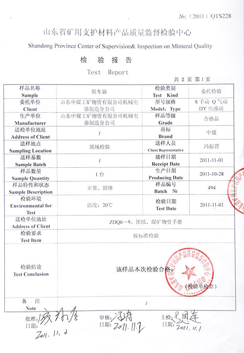 阻車器(S手動 Q氣動 DY電液動)質量檢驗報告
