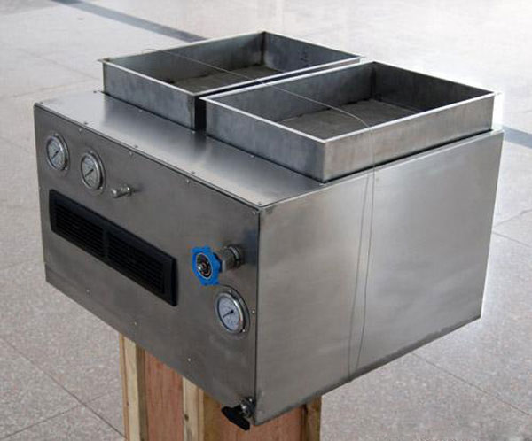 本凈化裝置可以設計成方形,配有四個料箱,可采用壓縮空氣或者氮氣單獨推動氣動風扇工作,該凈化裝置采用下抽風的通風方式,即氣動風扇工作時,向箱外排氣從而使凈化箱體內形成負壓區,密閉空間內的氣體流經化學藥劑層,進入凈化箱體內,并隨著氣動風扇的抽吸排向凈化箱外。有害氣體經過化學藥劑層時與化學藥劑進行化學反應或催化反應,轉變成固態物質或其它氣體,從而達到濾除凈化之目的。