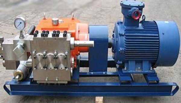 本系列噴霧滅塵泵為臥式三柱塞往復泵,由臥式四極防爆電動機驅動,經聯軸器和一級斜齒圓柱齒輪減速后帶動曲軸旋轉,再經過連桿滑塊機構使曲軸的旋轉運動轉變為柱塞的直線往復運動。