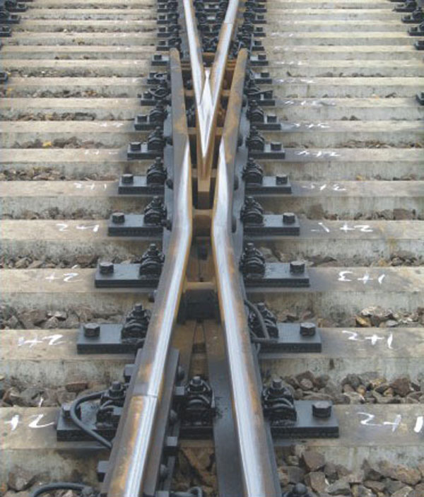 直線式固定轍叉分兩種,即整鑄轍叉和鋼軌組合式轍叉。鋼軌組合式轍叉 用鋼軌及其他零件經(jīng)刨切拼裝而成,由長(zhǎng)心軌、短心軌、翼軌、間隔鐵、轍叉墊板及其他零件組成。它取材容易,無(wú)特殊工藝要求,加工制造方便,但零件多,養(yǎng)護(hù)工作量大,已很少使用。