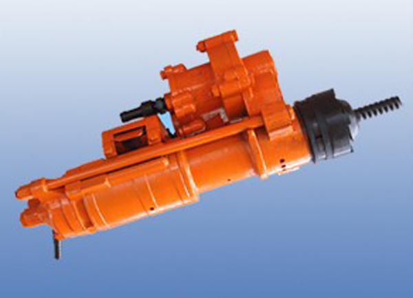 YGZ100型導軌鉆機采用了沖擊與轉釬各自獨立的結構沖擊能與釬桿轉速可根據(jù)礦巖條件分別調節(jié)。沖擊部分采用無閥配氣,能較好的利用壓縮空氣的膨脹作功。轉釬部分采用無閥配氣,能較好的利用壓縮空氣的膨脹作功。轉釬部分采用齒輪氣馬達驅動,經(jīng)兩級正齒輪減速帶動釬桿回轉。齒輪式氣馬達布置在鑿巖機的上部,以縮短鑿巖機的總長度。因此更適用于在井下狹窄的采礦場作業(yè)。