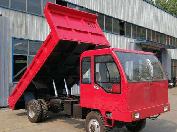 礦用四驅(qū)車的車廂分后向傾翻和側(cè)向傾翻兩種,通過操縱系統(tǒng)控制活塞桿運(yùn)動(dòng),后向傾翻較普遍,推動(dòng)活塞桿使車廂傾翻,少數(shù)雙向傾翻。高壓油經(jīng)分配閥、油管進(jìn)入舉升液壓缸,車廂前端有駕駛室安全防護(hù)板。