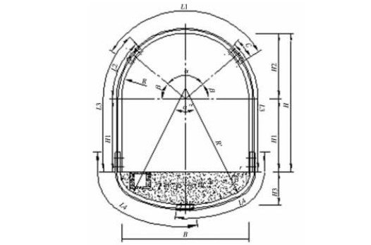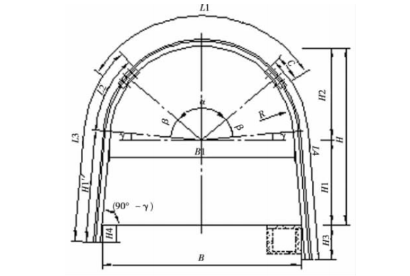 普通架型設計簡單,需要注意的是α和β角的選擇,應綜合考慮支架規格尺寸,圍巖特征、礦井提升運輸能力及施工方法等,綜合權衡選擇α和β角以使分節長度l1、l3、l4限制在合理范圍內,對于寬度超過4m的大斷面支架,一般還應在l1中進一步分段,以便運輸、施工。